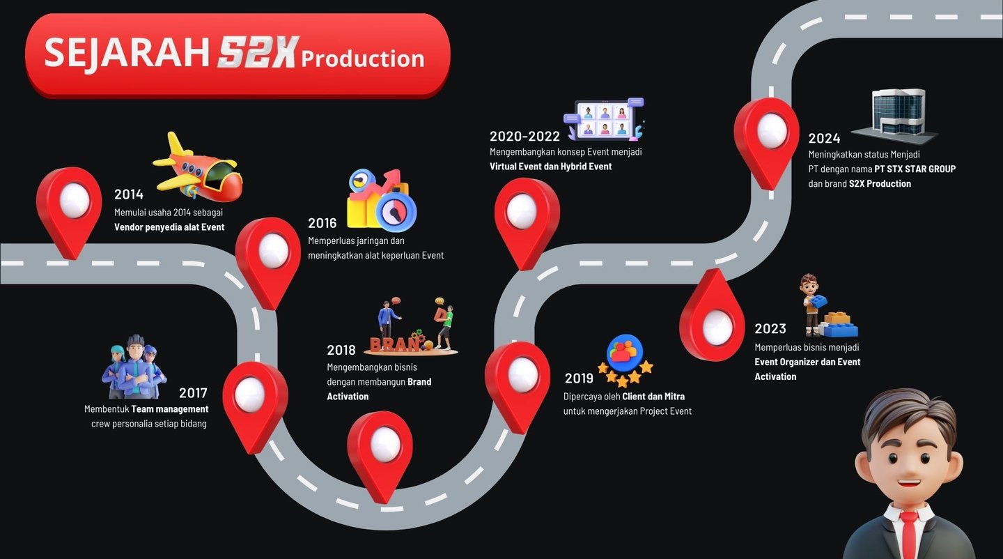 S2X Production adalah Perusahaan Event Organizer (EO) yang telah beroperasi lebih dari 10 tahun memiliki banyak keunggulan yang dapat memberikan nilai tambah bagi klien kami. Pengalaman yang luas, jaringan vendor yang kuat, tim yang terlatih, serta kemampuan untuk beradaptasi dengan perubahan dan menangani krisis menjadikan kami pilihan ideal bagi siapa saja yang ingin menyelenggarakan acara yang sukses dan tak terlupakan. Reputasi yang dibangun selama lebih dari satu dekade juga menjadi bukti bahwa perusahaan kami mampu memberikan layanan yang berkualitas dan profesional.